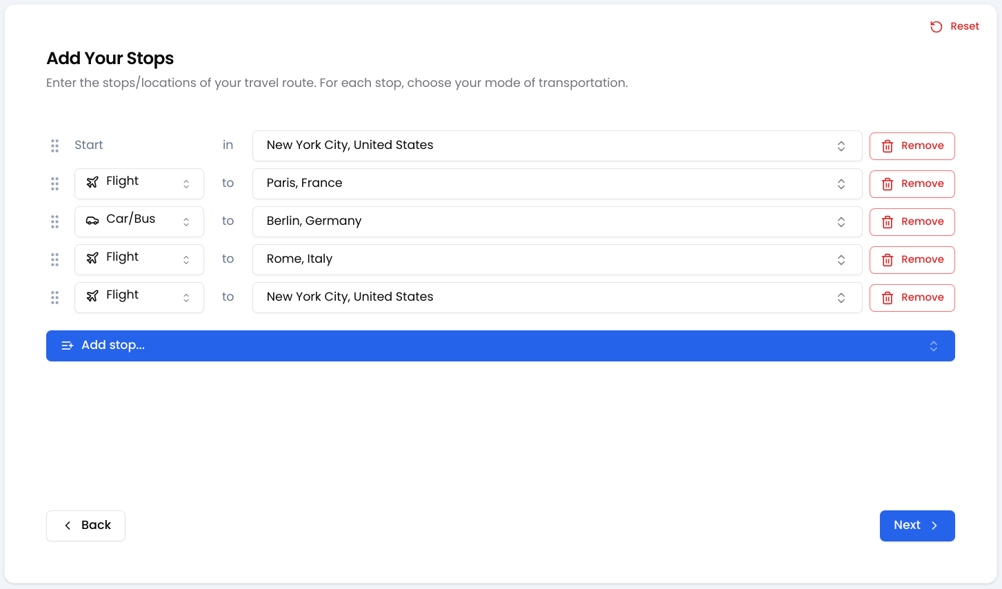 Next, it's time to plot your journey. Enter the destinations on your itinerary and select your preferred mode of transport between each stop.