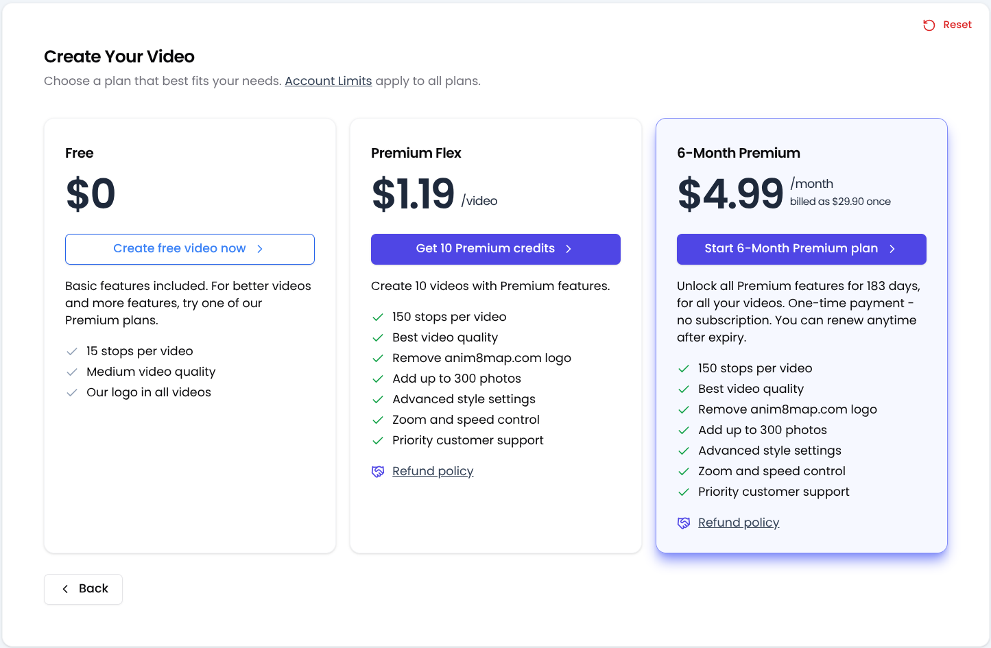 Select your preferred plan and proceed to create your video. If you enabled a Premium feature, you can choose to generate a short preview of your Premium video before purchasing a Premium plan.