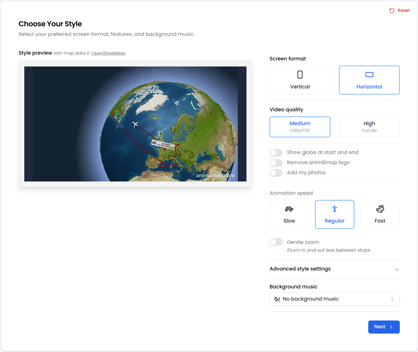 The fun begins! Start by selecting your preferred style options. You can customize various aspects of your animated map: