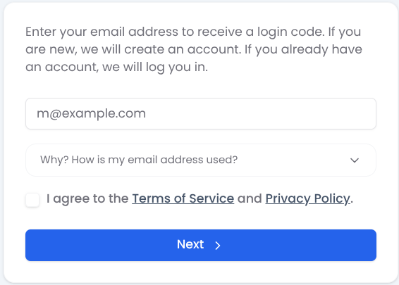 Simply enter your email address and agree to the Terms of Service, then click "Next" to proceed.