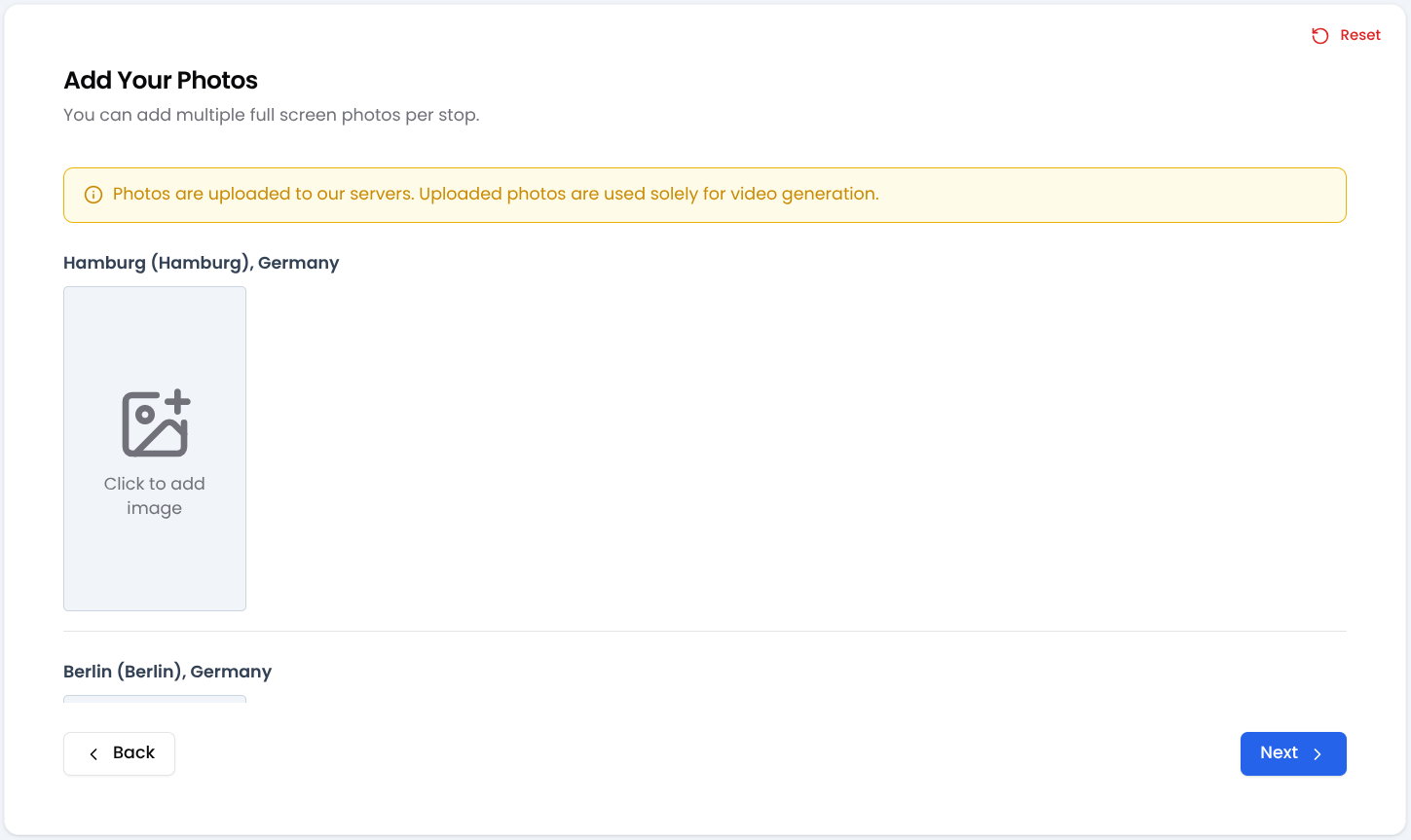 The photo page allows you to upload one or more images for each destination. When your final travel animation plays, these photos will be displayed one by one as the animation reaches each stop.